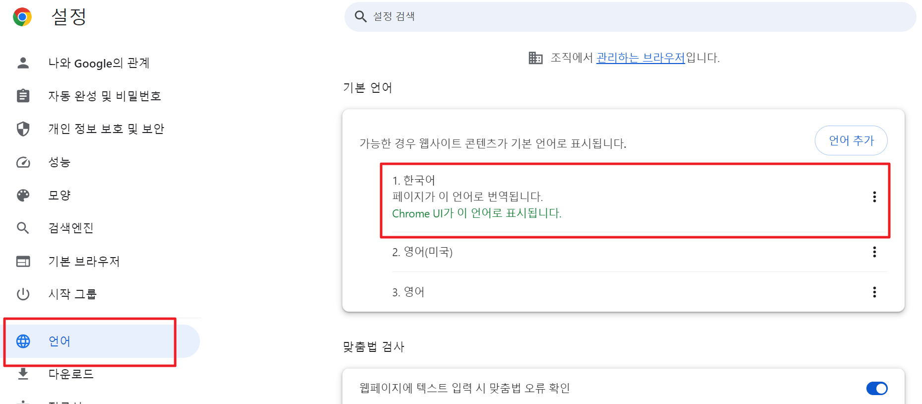 이럴 경우 설정 페이지에서 기본 언어를 영어로 바꿔주는 방법을 사용하시면 됩니다.