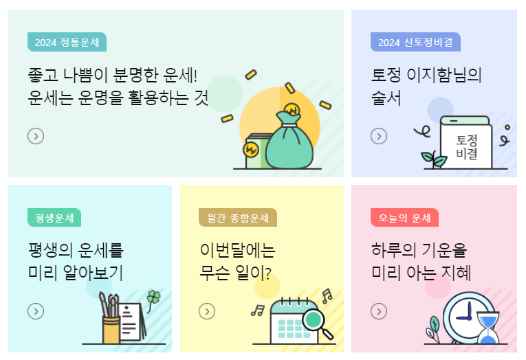 농협은행에서 제공하는 무료토정비결은 총 6가지로 구성되어있습니다.