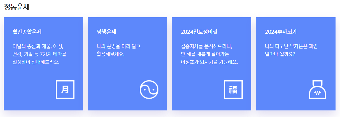 2024년 신년운세 / 사업 및 직장 운세 / 이성 및 대인관계 운세 / 재물 / 가정 / 건강 등 여러가지 분야에서 어떤 삶을 살게될지 미리 확인해보시기 바랍니다.