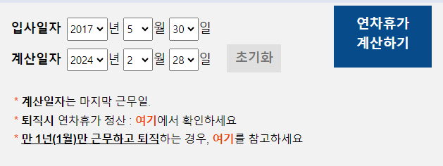 다만 간단하게 연차계산기를 이용하여 내 입사일자만 알고 있다면, 누구나 쉽게 내 연차개수를 확인해볼 수 있습니다.