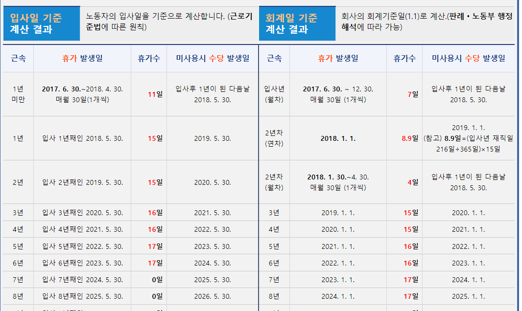 이 처럼 회사 내규에 따라 입사일 기준일지 회계일 기준인 1월 1일 기준일지에 따라 구분되어 계산해주는 것을 확인해볼 수 있습니다.