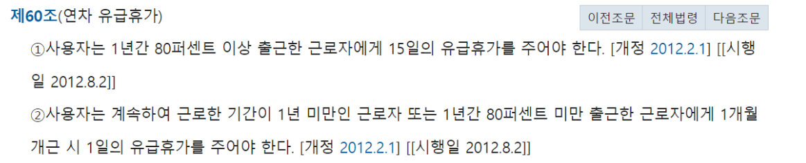 아래에서 근로기준법 제 60조 연차 유급휴가에 대해 안내해드리도록 하겠습니다.