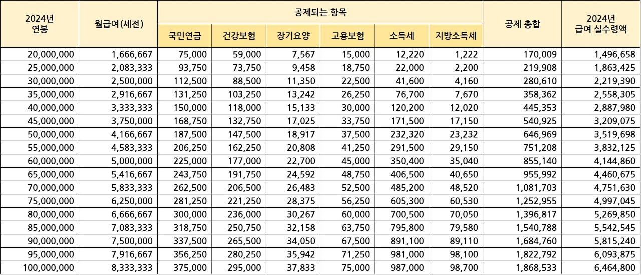 아래는 2024년 기준으로 공제되는 항목이 공제된 급여 실수령액을 500단위의 연봉대로 표로 만들어낸 것 입니다.