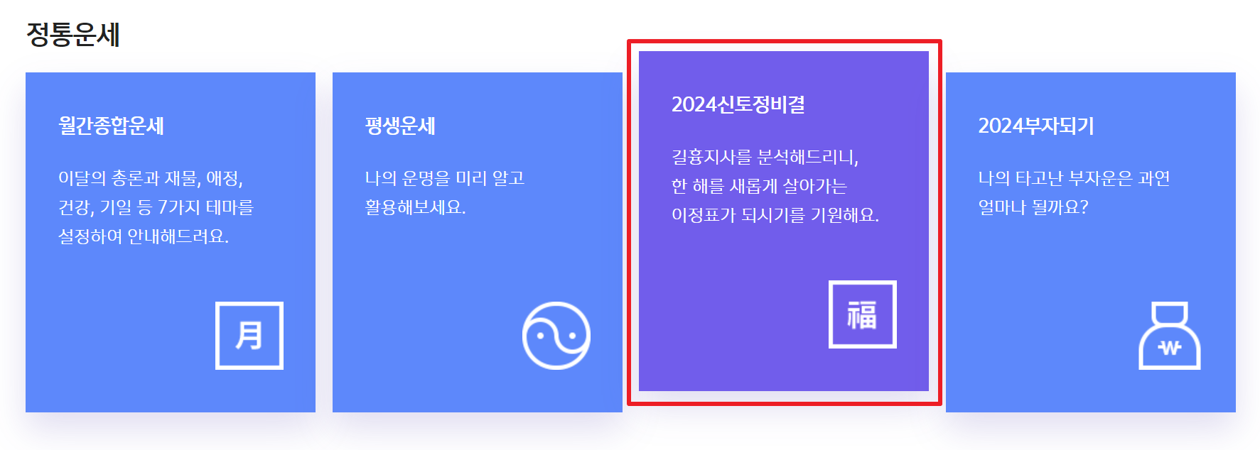 아래 오른쪽 [신토정비결 토정 이지함님의 술서]를 클릭 후 내 신년운세를 확인해보시기 바랍니다.