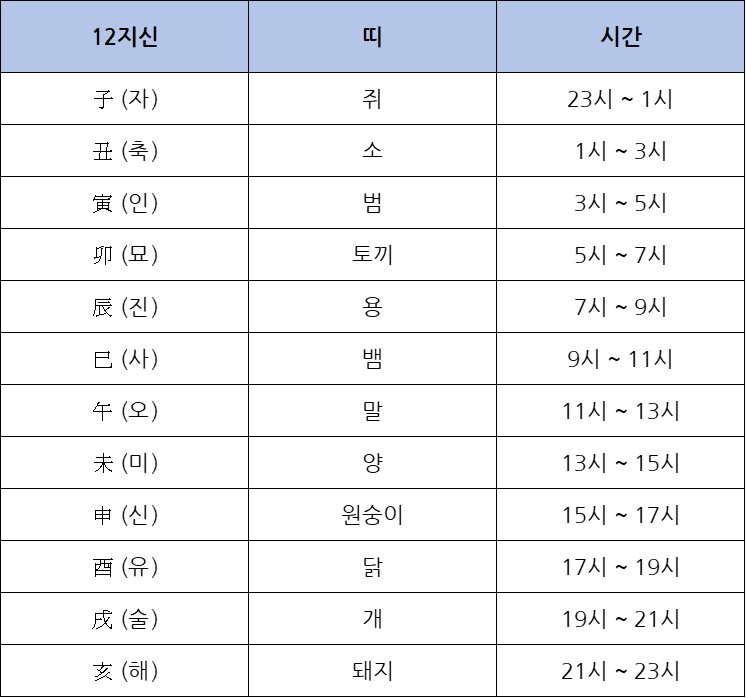 이 표는 12지신을 순서대로 표로 정리해놓은 것 입니다. 이처럼 시간에 그 동물이 가장 활동적이기 때문에 그 특성을 따서 해당 시간을 지킨다고 하는데요, 이는 시간 뿐 아니라 1년씩 해가 바뀔 때마다 표현되기도 합니다.