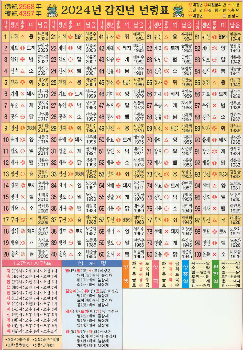 2024년 갑진년 연령표는 아래와 같습니다.