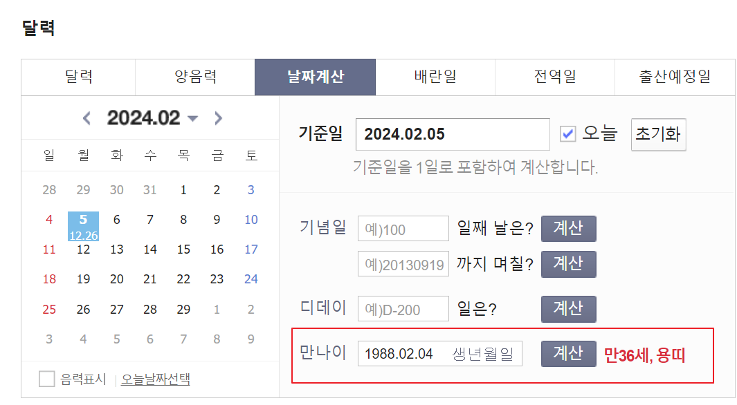 한국식 나이인 띠별 나이를 계산하기 위해서는 아래 버튼을 이용해 만나이에서 1을 더해주면 됩니다.