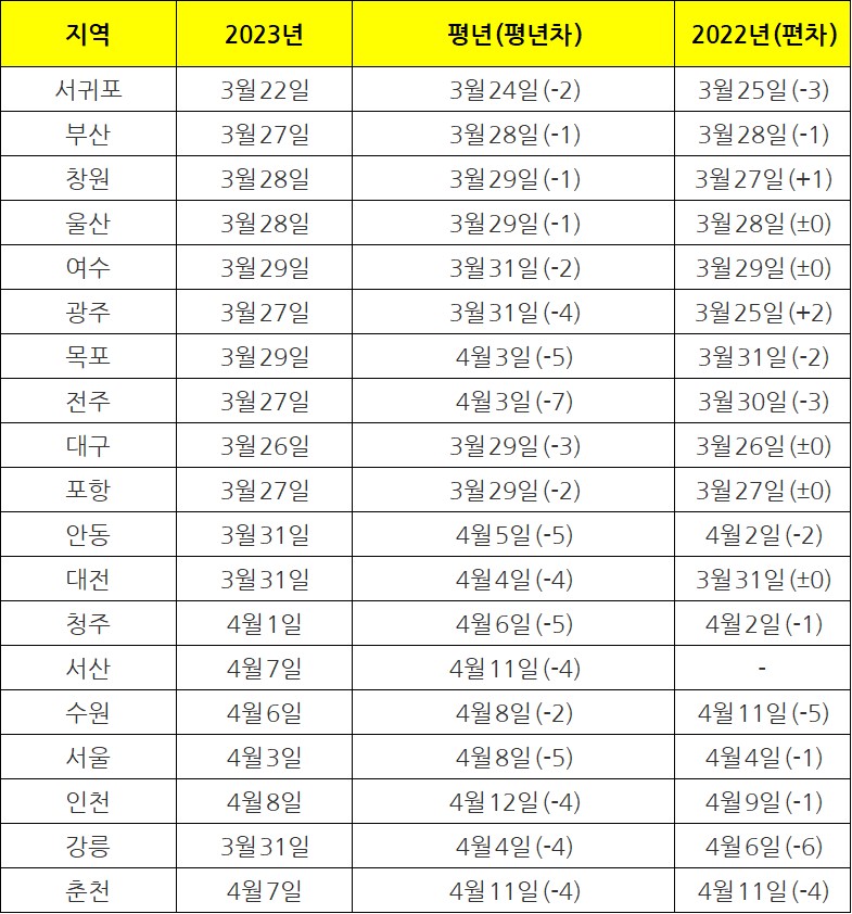 사실 2023년은 평년보다 2~5일 가량 일찍 피기 시작했으며 서울의 경우 4월 3일에 개화하고 10일 경에 절정에 이르렀습니다.